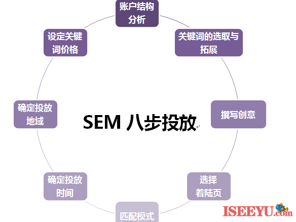 賬戶結構分析->關鍵詞選取拓展->撰寫創意->選擇著陸頁面->匹配模式->確定投放時間->確定投放地域->設定關鍵詞價格