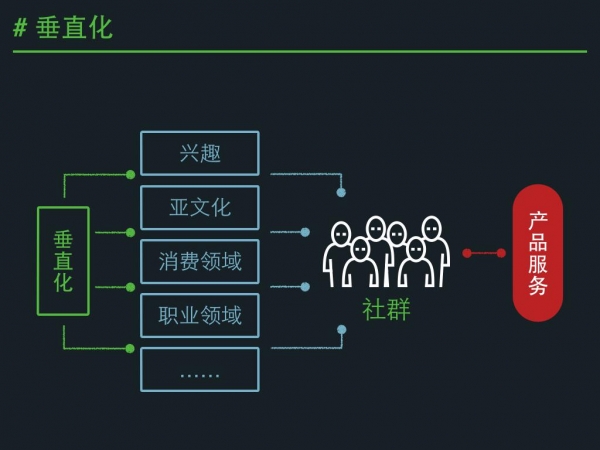 上圖就是我對(duì)垂直化趨勢(shì)發(fā)展的一個(gè)理解,比如基于興趣(旅游、健身)、亞文化(二次元、宅)、專業(yè)領(lǐng)域(程序員、產(chǎn)品經(jīng)理、律師、醫(yī)生)等等,這些垂直的領(lǐng)域都可以加入社群的玩法。每個(gè)領(lǐng)域都有自己獨(dú)有的社群 這是一個(gè)分類細(xì)化的描述,有的先有社區(qū),后有交易服務(wù);有的先有交易服務(wù)、產(chǎn)品,后有社群...這里面有很多例子:比如鐵血網(wǎng),一開(kāi)始做軍事愛(ài)好者群體,后發(fā)展電商;小米先有產(chǎn)品后基于社群最大化營(yíng)銷等等。