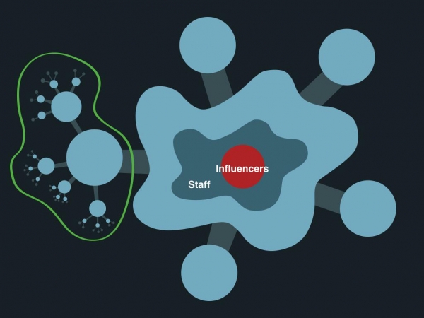 這是一個(gè)抽象出來(lái)的社區(qū)人群結(jié)構(gòu)圖譜。社群里面的用戶基本劃分為三個(gè)類別:STAFF工作人員、意見(jiàn)領(lǐng)袖(大V)和普通用戶。工作人員,也就是社群的構(gòu)建者,類似城市的政府,建立城市的準(zhǔn)則法律等等,引導(dǎo)社群的方向。往往一個(gè)活躍的社群,都會(huì)有一小部分(核心)意見(jiàn)領(lǐng)袖,每一個(gè)意見(jiàn)領(lǐng)袖可能都有粉絲群體的概念。