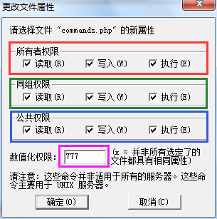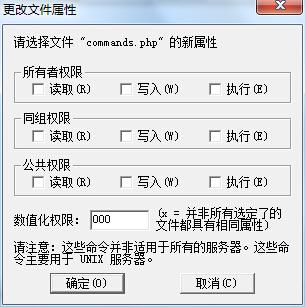 比如我要對commands.php文件進行權限的設置,我就在FTP中打開文件屬性,可以看到這個文件權限設置的界面。下邊給大家說一下每一個選項所代表的數字。