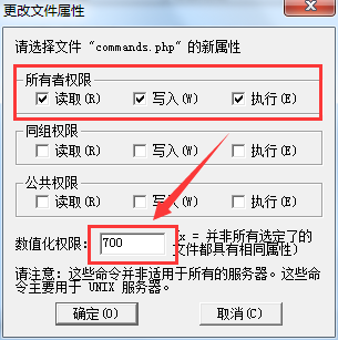 比如我要給commands.php文件設置所有者權限為可讀寫,可執行,那么就在所有者權限上全部打勾(如下圖),而在數值化權限那里就會顯示“700”