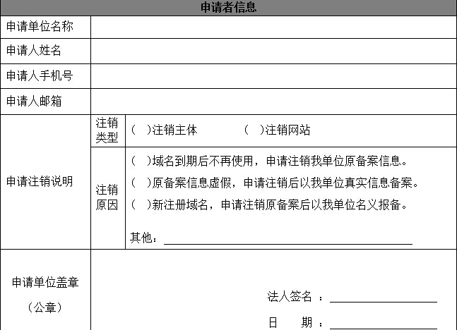 找到了備案中心的客服(我的域名是在這里備案的,所以建議大家在取消備案的時候,盡量找當時的備案商進行咨詢),我說明了情況,然后就填寫了一張域名取消備案的申請(如下圖),帶上身份證的掃描件,用傳真一塊發了過去。客服說她們那里3天以內提交給管局,管局5天內就可以給取消備案,到時候會發短信和郵件。
