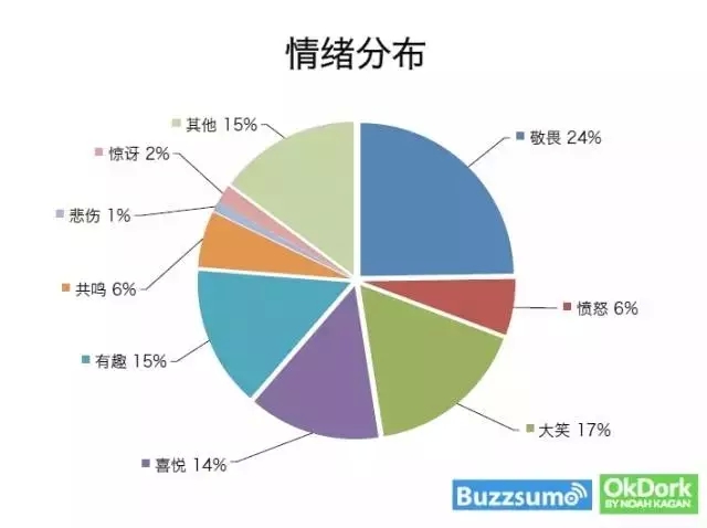 社交媒體追蹤服務(wù)分析工具BuzzSumo,前后對社交媒體上超過1億篇文章進行了分析,發(fā)現(xiàn)那些獲得最多分享轉(zhuǎn)發(fā)的內(nèi)容能引起用戶的情緒變化依次是:敬畏(25%)、大笑(17%)、娛樂消遣(15%)、高興(14%)、共鳴(6%)、憤怒(6%)、驚奇(2%)、悲傷(1%),其他情緒類型占15%。內(nèi)容激起用戶情緒,情緒帶動轉(zhuǎn)發(fā)行為。