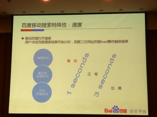 首先,我們先看一下在0910百度站長大會上的一張圖片“百度一定搜索特殊性:速度”。從圖片中我們可以看到,百度移動搜索計算網站移動頁面打 開速度是從“用戶點擊百度搜索結果開始計時,到第三方網站頁面LOAD事件觸發結束”,也就是說當用戶搜索搜索引擎點擊你的網址,到你網站打開頁面的這個 時間,百度進行判斷你網站的速度如何。從其中分出“最佳、正常、出局”三種。最佳說明你的網站打開速度比較快,比較好,是受到搜索引擎喜愛的。正常說明你 的網站速度一般,是可以打開的,搜索引擎在速度方面不會給你加分也不會減分,但是給與最佳排名的友好程度要高于正常。出局這個相信大家都能理解,也就是網 站的速度很慢,或者打不開。這樣的網站搜索引擎通過用戶的行為,一次兩次三次之后,你網站將被淘汰,不被顯示在搜索結果之上。