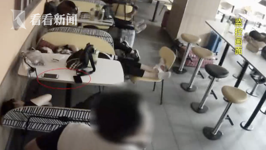 監控顯示:當天凌晨3點多,小高靠在餐廳靠近樓梯邊的座位上睡著了,兩部手機就放在餐桌上,一名中年男子在小高旁邊左顧右盼,然后慢慢靠近,順走了桌上的兩部手機。