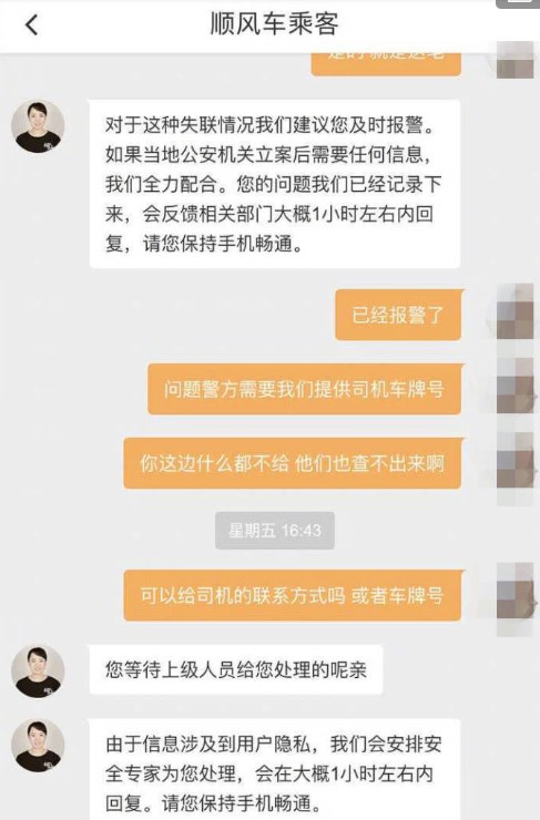 直至晚間,滴滴方面才將順風車司機具體信息和車牌號告知警方,警方隨后認定該司機有重大作案嫌疑展開追查。