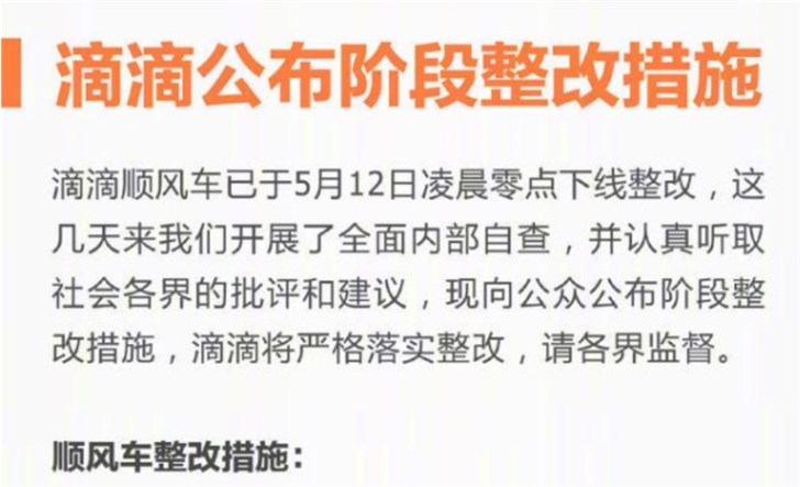 受輿論壓力所迫,5月12日起,滴滴宣布下線順風車業務一周,之后滴滴公布了順風車整改措施。措施主要針對車主審核和社交化功能,包括隱藏雙方頭像、關閉評論、引入車主人臉識別、在App中增添緊急求助按鈕等具體改動。據內部人士透露,此前滴滴有意干脆取消順風車業務。
