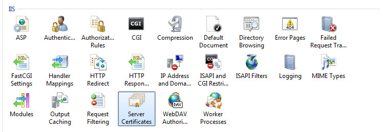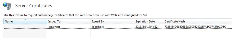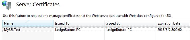 回到IIS,打開Server Certificates,發(fā)現(xiàn)證書已創(chuàng)建成功,如圖: