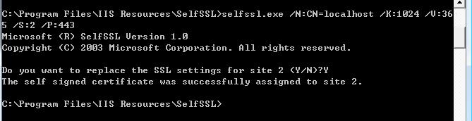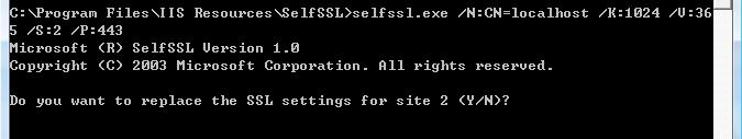 接下來,在SelfSSL里輸入命令:selfssl.exe /N:CN=localhost /K:1024 /V:365 /S:2 /P:443,回車之后,見下圖: