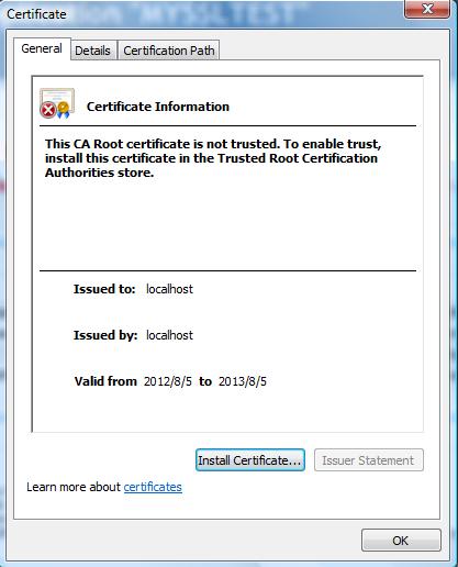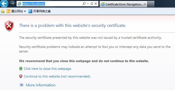 我們創(chuàng)建的證書,Issued To,Issued By都是同一個,這種叫做根證書,該證書需要存放在Trusted Root Certification Authorities目錄下,網(wǎng)站才會被信任,這可以通過certmgr.msc查看。那么如何讓SSL驗(yàn)證通過呢,即如何讓鎖形安全標(biāo)志出來呢,有兩種方法: