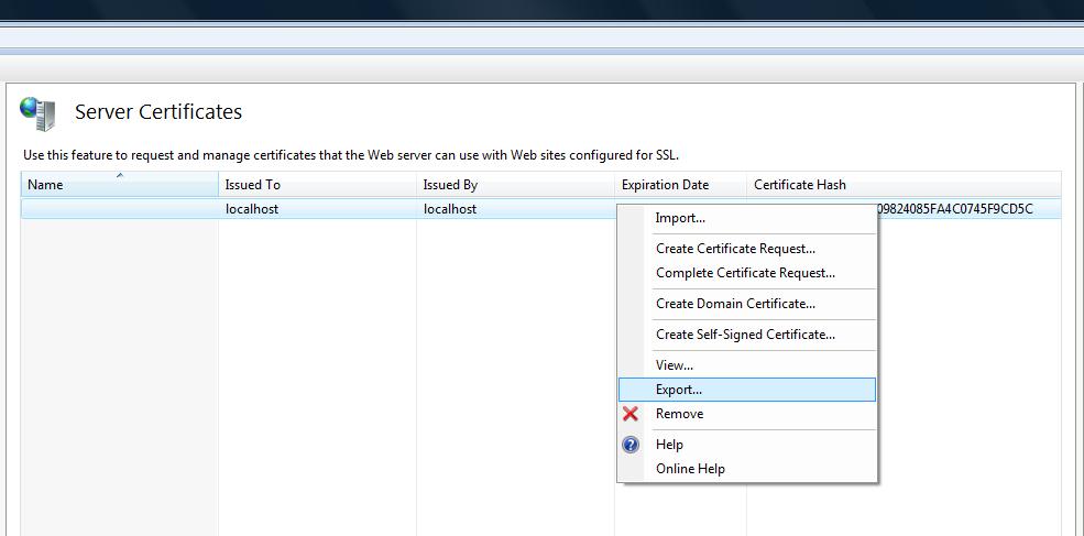 2.回到IIS,打開Server Certificates,選中我們創(chuàng)建的證書,右鍵,導(dǎo)出證書,見圖: