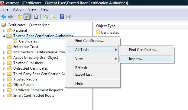 在 開始-運(yùn)行 里輸入certmgr.msc,打開Certificate Manager,找到Trusted Root Certification Authorities目錄,