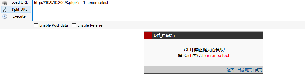 搭建IIS+ASP/ASPX+MSSQL環(huán)境,思路一致,只是語言與數(shù)據(jù)庫特性有些許差異,繼續(xù)來張D盾攔截圖: