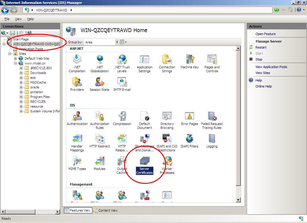 2.鼠標在左邊窗口點擊服務器,中間窗口點擊“Server Certificates”,如下圖: