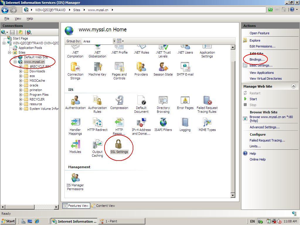 6.在左邊窗口選擇安裝證書的網站,然后在中間窗口,選擇“SSL Settings”,再在右邊窗口點擊“Bindings...”,如下圖: