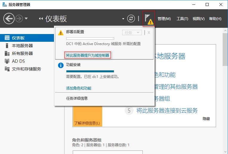 1)打開服務器管理器,點右上角點小旗子,點 將此服務器提升為域控制器;