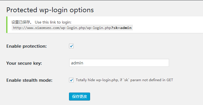 Enable protection:啟用登陸保護 Your secure key:你的自定義登陸地址,如果不是包含有這個安全秘鑰的登陸地址即使你的用戶名和密碼正確,都沒辦法登錄 Enable stealth mode:啟用隱身模式,如果不是包含安全密鑰的登陸地址,不會顯示登陸表單