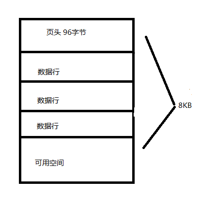 頁:用于數據存儲的連續的磁盤空間塊,SQL Server中數據存儲的基本單位是頁,磁盤I/O操作在頁級執行,頁的大小為8KB。每頁的開頭是96字節的頁頭,用于存儲有關頁的系統信息,包括頁碼、頁類型、頁的可用空間以及擁有該頁的對象的分配單元ID;其他便是存儲數據的數據行與剩下可用空間,結構圖如下(個人繪制)