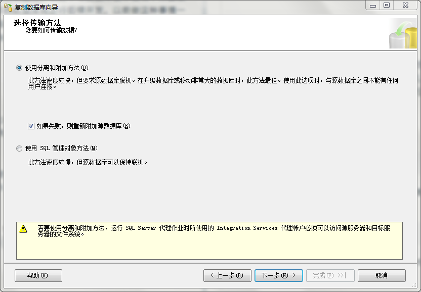 “若要使用分離和附加方法,運行SQL Server代理作業時所使用的Integration Services代理賬戶必須可以訪問源服務器和目標服務器的文件系統”