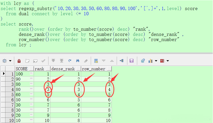 dense_rank() 該函數(shù)不會(huì)跳號(hào),分?jǐn)?shù)相同為并列第一,下一個(gè)是第二。