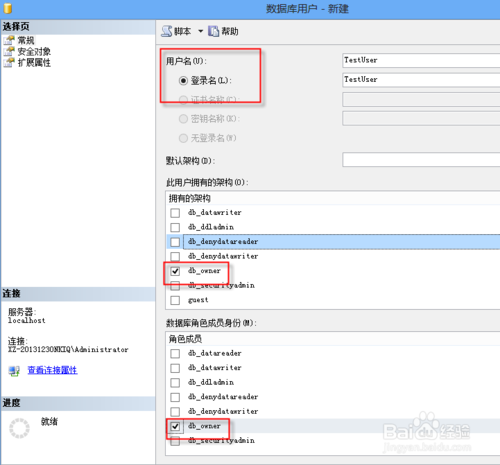 將剛才用戶名輸入即可,然后勾選用戶架構(gòu)和角色;這里就勾選db-owner(擁有完全權(quán)限)