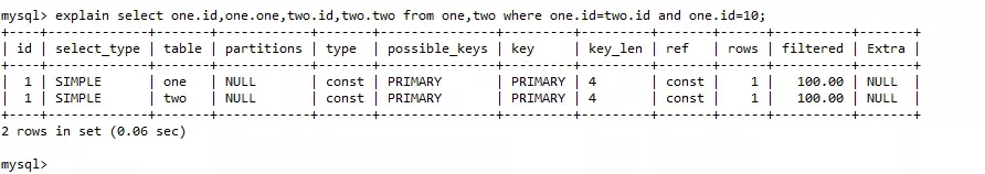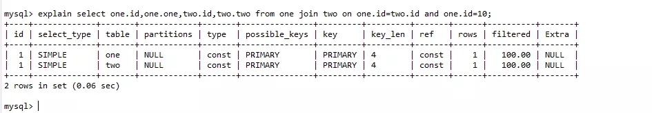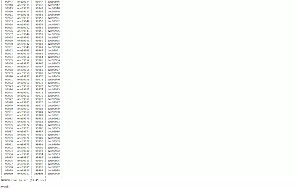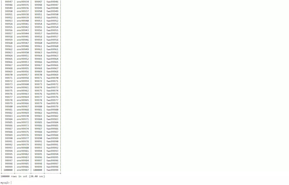 為了突出兩種查詢的性能差異,往one表中插入100w條數據,往two表中插入10w條數據,在大量數據面前,一絲一毫的差別也會被無限放大;這時候在來比較一下差異