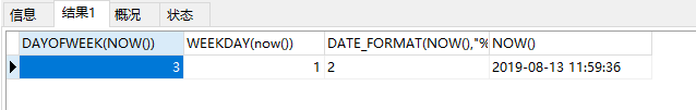 SELECT DAYOFWEEK(NOW()),WEEKDAY(now()),DATE_FORMAT(NOW(),"%w"),NOW()