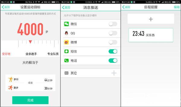 用app設置運動目標的時候,這里再一次體現了唯樂app對運動方面的用心,一般的智能手環app,在設置運動目標時,僅僅只有一個步數設置,而唯樂app將每個階段步數,用稱呼來分類了,例如業余選手4000步等,可以讓你更好的設置運動目標。而消息推送跟日程提醒這個兩個功能,在上面我也已經做了實際體驗展示,具體體驗就是那樣。