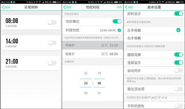 日常鬧鐘,我也測試過,一到時間,唯樂Now2就是震動提醒你,感覺還可以,今早就試了一會,挺準確的。勿擾模式就是在一定時間段,不接受消息推送?;驹O置可以設置佩戴習慣,還有翻腕亮屏等功能,其中豎屏顯示就是在這里設置的。