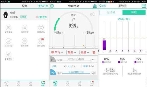 說完唯樂Now2的外觀體驗,現在來說說app方面的功能吧!其實如果不不需要消息推送還有日程提醒,唯樂Now2也是可以脫離手機運行的,脫離手機后,唯樂Now2可以做到運動監測,心率監測,還有時間提醒,那么手機端app到底能做什么呢?首先是唯樂Now2的功能設置,還有就是數據記錄,這里需要說一下,唯樂app的數據記錄,跟其他智能手環的app完全不同,唯樂可以說是更加豐富詳細,這也是官方所說的智能識別運動狀態功能,你可以看到低運動量的時間,還有摘下手環的時間!記錄的數據信息十分豐富!另外唯樂Now2還支持睡眠監測,同樣數據也可以同步到app上。