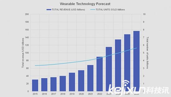 專注智能科技市場研究的調(diào)研公司IDTechEx發(fā)布的最新的一批報告,報告中稱智能穿戴設備市場市值將超過300億美元,到2018年,該市場將以10%的增幅穩(wěn)步增長至400億美元;到2023年,這一市場將加速增長(23%)到1000億美元,隨后將于2026年放慢速度(11%),市場規(guī)模為1500億美元。