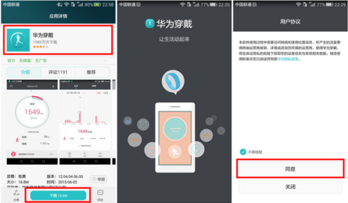 第一步:下載華為穿戴APP:請您先在華為應用市場、Google Play、App Store中搜索并下載“華為穿戴”APP并安裝到手機上。產品包裝盒附有華為穿戴APP二維碼,可以掃描下載。