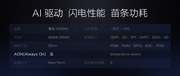 此外,“黃山1號(hào)”是全球首款集成AI神經(jīng)網(wǎng)絡(luò)模塊的可穿戴處理器,也是全球首款RISC-V開源指令集可穿戴處理器,擁有AI驅(qū)動(dòng)、閃電性能、苗條功耗三大特點(diǎn),應(yīng)用了Always on技術(shù),區(qū)別于傳統(tǒng)AI,實(shí)現(xiàn)了AI從云到端的前移,實(shí)時(shí)計(jì)算無需傳輸。相比Arm Cortex-M4架構(gòu)處理器運(yùn)算效率高出38%。