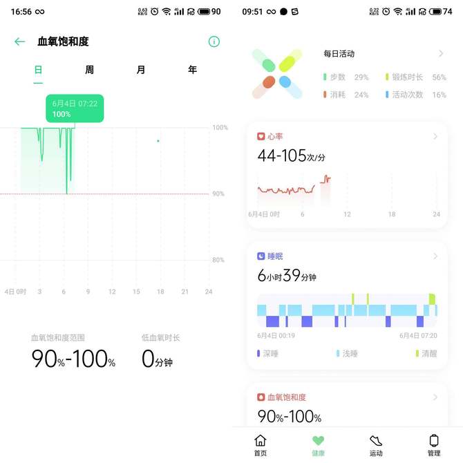 OPPO 手環內置的光學血氧傳感器和光學心率傳感器,在你睡覺時實時監測你的身體血氧飽和度和呼吸狀態。并且有效反饋睡眠呼吸問題,同時監測你的睡眠質量 ,記錄你的睡眠時間以及深睡時間,配合CBTI標準制定具有針對性睡眠改善方案,幫助培養和改善睡眠習慣。在實際使用中確實可以反映我一整晚的睡眠狀態,并且將整晚每秒數據都記錄了下來,目前只有OPPO可以做到連續每秒血氧檢測。記錄的數據和我個人實際的睡眠質量感覺差不多,并且我喜歡晚睡的這個問題也被它發現并向我指出。個人覺得在健康方面該做到的都做到了。