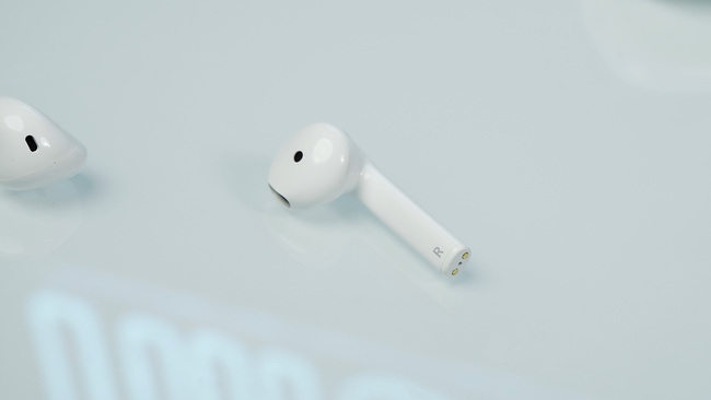 耳機本體是現(xiàn)在較為常見的TWS耳機主流設(shè)計,耳機柄稍寬一些,相比于橢圓形更接近R角過度弧線較大的圓角方柱形,底部的充電觸點位置有輕微內(nèi)凹,這樣在佩戴時觸點更不容易暴露在外,耳機的一體性看起來更好。