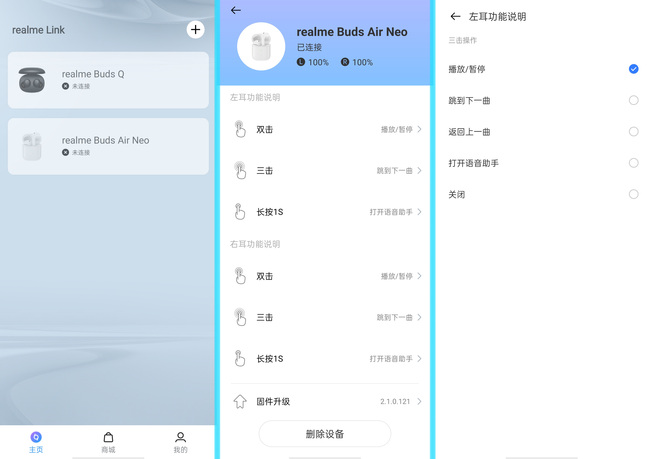 當(dāng)前可以使用realme Link APP對耳機進行設(shè)置(兼容其他安卓手機),除了能分別查看左右耳電量以外,也可以對觸摸操作進行具體設(shè)置,比如左右耳的雙擊和三擊都可以設(shè)置成播放/上一曲/下一曲/語音助手等不同快捷方式。