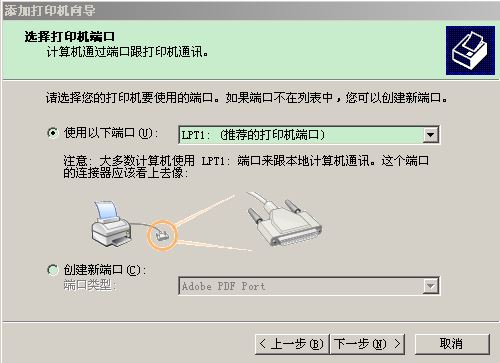 4.明確打印機(jī)使用的端口,針式打印機(jī)一般采用lpt1端口。用鼠標(biāo)單擊“下一步”按鈕,如下圖所示。