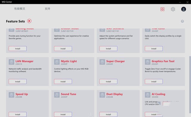 新版的MSI Center對各項功能進行了分類規整,安裝好后并不會將所有功能一起裝好,而是可以讓用戶自行選擇需要的功能進行安裝,避免冗余復雜的菜單影響用戶的觀感和體驗。