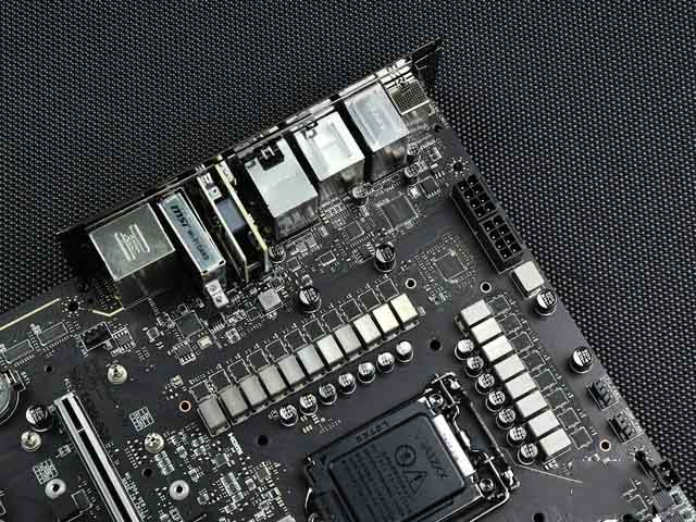 微星MEG Z590 ACE戰神主板的散熱裝甲非常厚實,尤其是VRM的供電區域,由一大一小兩個超大金屬片組成,中間由金屬導熱管連接,還都在底部準備了高質量導熱墊,保證散熱的穩定。