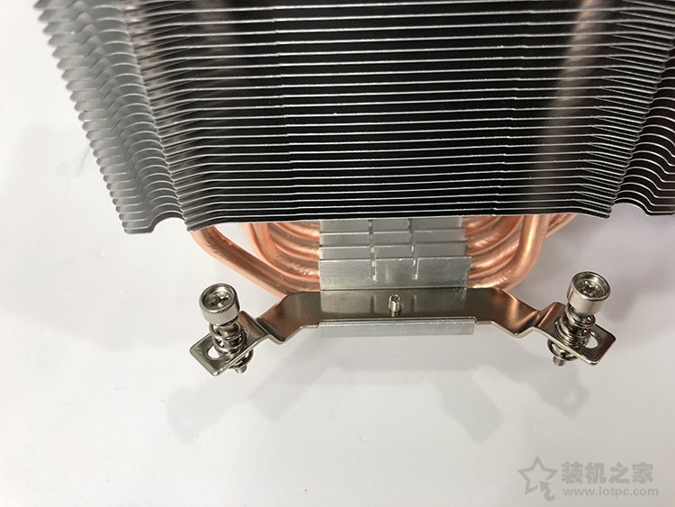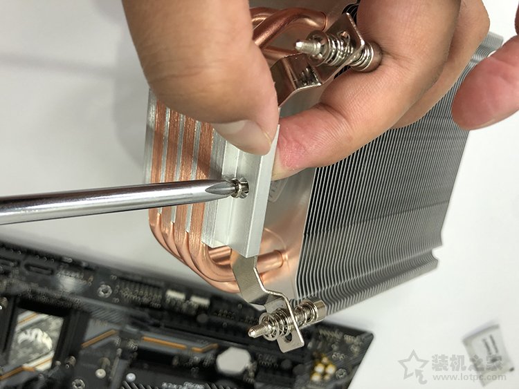 8、我們找到長條扣具,將其固定在散熱器底座上,并使用CPU散熱器附送的螺絲固定住,如下圖所示。