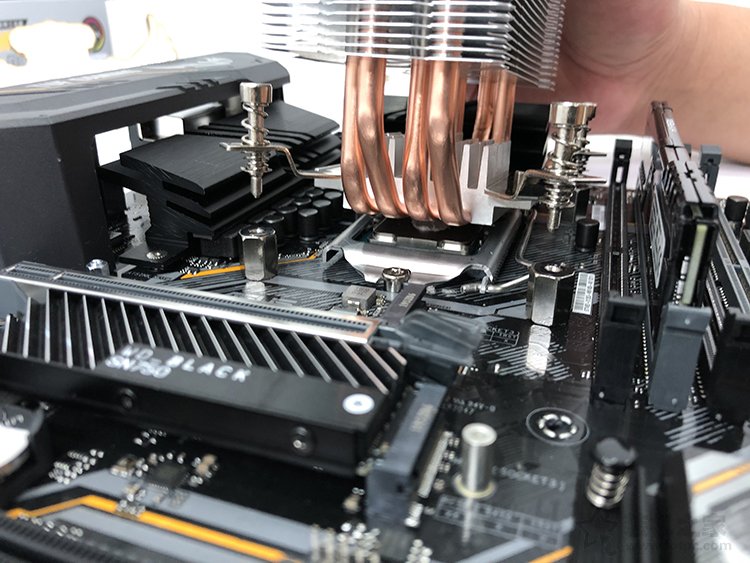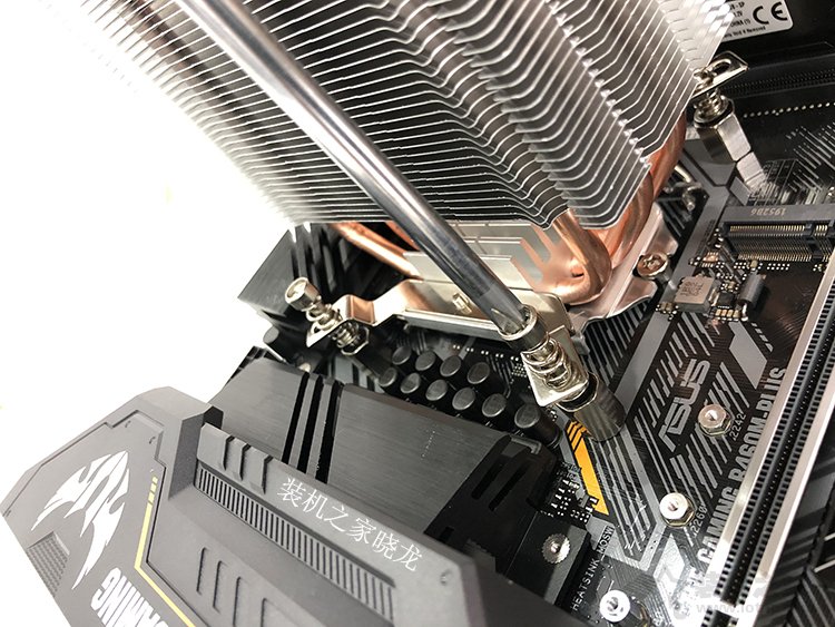 14、在CPU表面涂抹硅脂完畢之后,我們將CPU散熱器主體拿起來,將四個彈簧螺絲對準之前固定的四個六邊形螺絲上,可以先用手擰上去固定住。