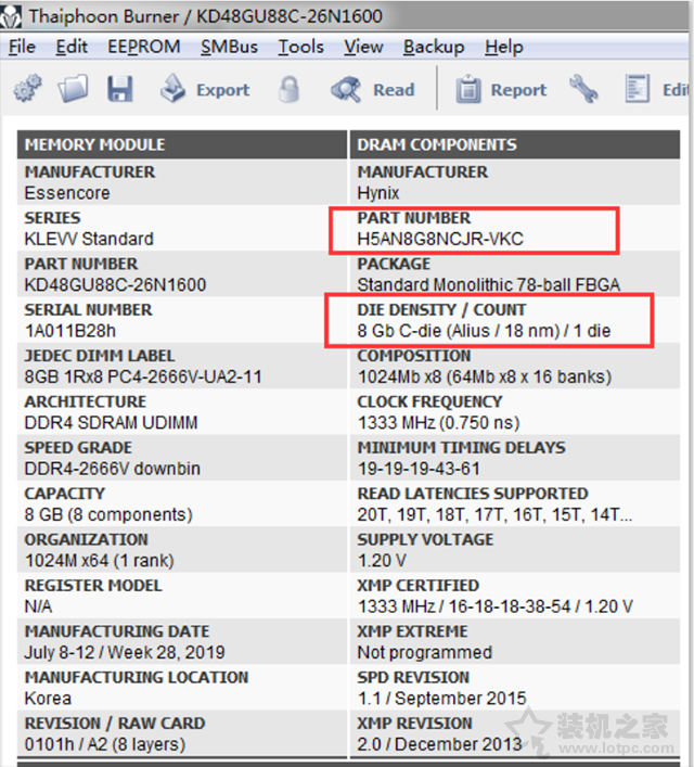 內(nèi)存顆粒查詢軟件我們可以采用Thaiphoon Burner(臺(tái)風(fēng))軟件進(jìn)行檢測,可以檢測到內(nèi)存各個(gè)信息,最好更新到最高版本,軟件檢測不一定百分百準(zhǔn)確哦。打開Thaiphoon Burner(臺(tái)風(fēng))這款軟件之后,我們點(diǎn)擊“Read”讀取內(nèi)存查看PART MUMBER(顆粒編號(hào)),從顆粒信息中可以看出這根內(nèi)存是CJR顆粒的。