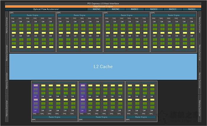 而RTX4080在完整的AD103核心的基礎上做了些精簡,閹割了2組GPC中的各2組SM單元,開啟了76組SM單元,相比完整版AD103架構少了512個流處理器,為9728個CUDA核心,稍微縮減了Tencor Core和RT Core數量,搭載了完整的64MB二級緩存,相比RTX3090Ti的6MB提高了10倍還要多,二級緩存能夠有效提升內部傳輸帶寬,進而提升游戲性能。