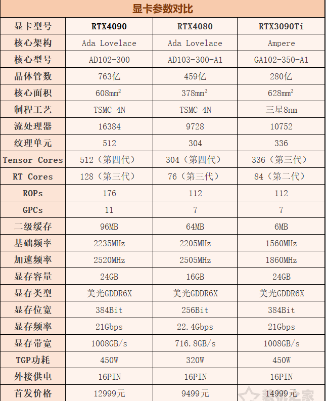 我們先來看看RTX4090和RTX4080以及上一代旗艦級RTX3090Ti顯卡的參數對比,如下圖示。