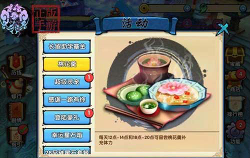 2、每日12:00——14:00和18:00——20:00在這兩個時間段內可以通過桃花羹活動領取體力值,體力是增長人物角色經驗的要素,有了更多的體力值就可以進行更多次數的歷練副本掃蕩,獲得更多的角色經驗。