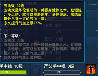 還有就是五禽戲,五禽必不可少,要升級,這就看你平時勤勞不,每天商儈200點貢獻,然后幫戰跑商,有錢可以發票,這樣要點到55級就有6000多血了。