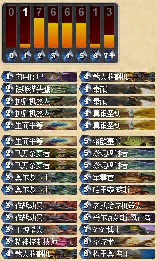 在卡組微調方面:僵尸只帶一個,能很好的壓制獵人的天胡起手,前期沒抓到的話,中期用來破陷阱也不錯,帶兩個感覺有點虧卡,打慢速的卡組太虧;貓頭鷹一定得帶一個,沉默送葬、女王、 佛丁什么的,很能穩住節奏;飛刀帶滿,前期賣了換送葬,中期配合作戰動員什么的,很容易取得優勢;王牌、130,簡直不解釋,環境神卡,感謝砰砰博士(雖 然怕這兩個,但是我也無法抗拒砰砰的強大,自己還是帶也著吧);軍需官,帶著是威懾,一旦出場有很大的場面優勢,但是兩張的話,我嫌卡手。。。而且這套騎 士偏快,感覺不適合帶兩張;哈里森環境神卡;女王、砰砰純粹賺節奏,上場就不虧;老司機帶了一個,8點奶量讓前期小錘子砍人更自信,很好的應對獵人的搶 血,和咆哮的斬殺線威脅以及紅龍噴一下之后的威脅。