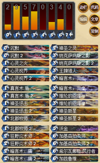 亡語(yǔ)牧師曾經(jīng)也是風(fēng)靡一時(shí),相比亡語(yǔ)獵人來(lái)說(shuō)節(jié)奏比較慢,如果前期能夠摸到送葬的話應(yīng)該說(shuō)是比較順利的,現(xiàn)在送葬被削弱之后幾乎都會(huì)替換成其他隨從。筆者作為喜愛(ài)牧師這個(gè)職業(yè)的玩家,對(duì)于牧師卡組的信息一直是十分關(guān)注的,本次給大家?guī)?lái)一套國(guó)外高玩Reyond的奇跡牧師,卡組如下: